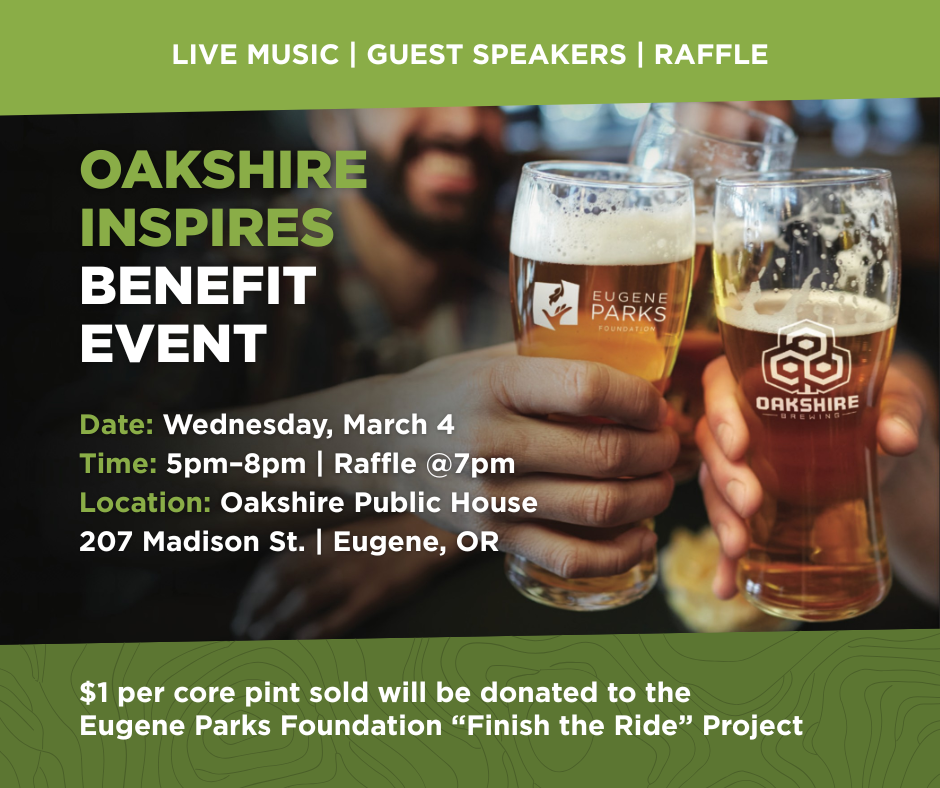 Oakshire Brewing and Eugene Parks Foundation invite you to Oakshire Inspires – a benefit night supporting Finish the Ride, the final features that will turn Eugene’s new mountain bike park into a complete riding destination. Grab a pint, catch live music and raffle prizes, and help bring the last trails + hubs to life.